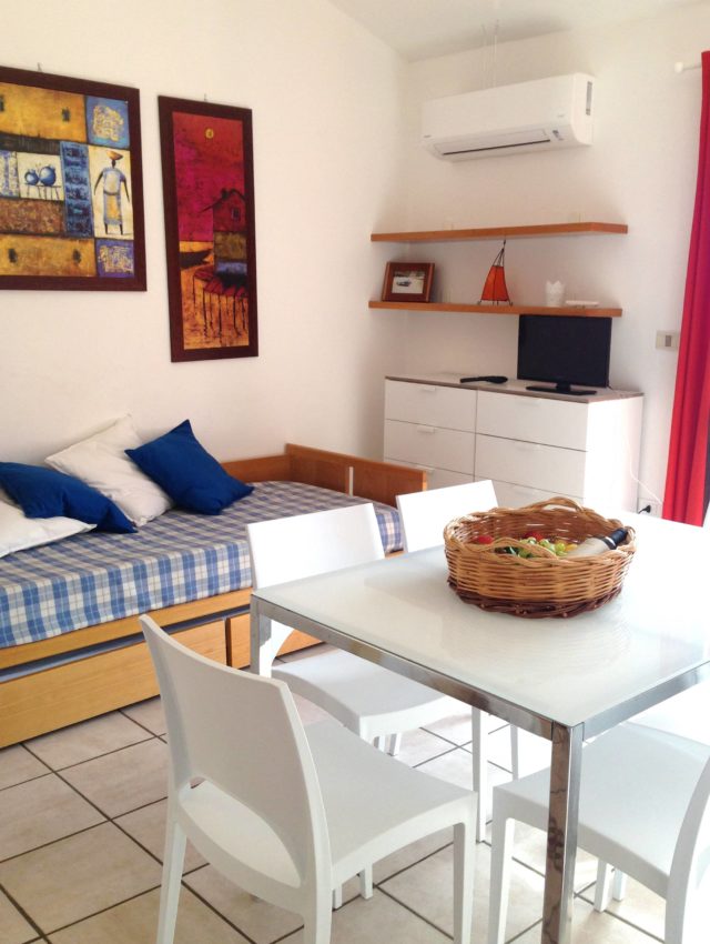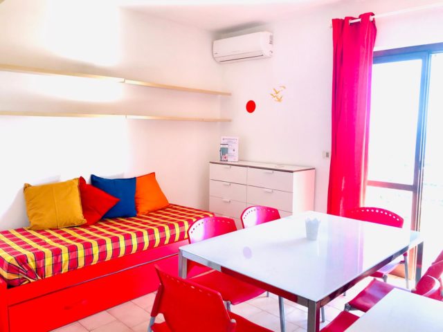 Il trilocale per 6 persone si compone di cucina, soggiorno-pranzo con divano letto doppio, camera matrimoniale, cameretta a due letti, bagno, ampio terrazzo, aria condizionata e lavatrice.